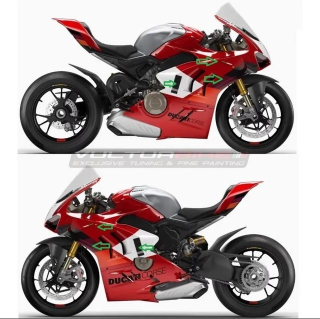 Personalizzate la vostra moto con gli Adesivi originali per carene laterali - Ducati Panigale V4R 2023. Gli adesivi decorativi di Vulturbike sono realizzati in vinile colorato stabilizzato ai raggi UV.