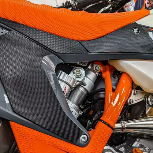 Manopola adesiva antiscivolo per serbatoio moto della gamma Evo di Eazi-grip, pretagliata specificamente per KTM 300/250/150 EXC. Il prodotto è progettato per offrire un migliore controllo della moto in accelerazione o in frenata, riducendo la fatica.