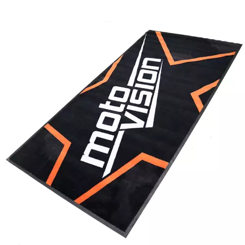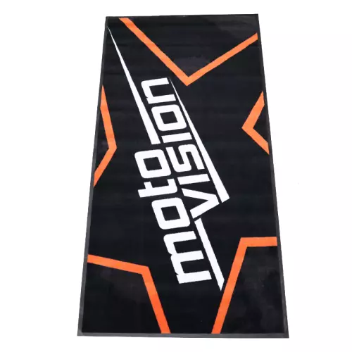 Questo tappetino con il logo Moto Vision misura 1m x 2m.