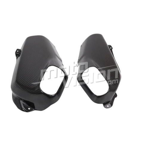 Protector escapes en carbono Ducati Panigale V4 V4R V4S da montare direttamente sui punti di fissaggio originali della moto per sostituire la carenatura originale. Le parti in carbonio vengono fornite senza viti e bulloni.