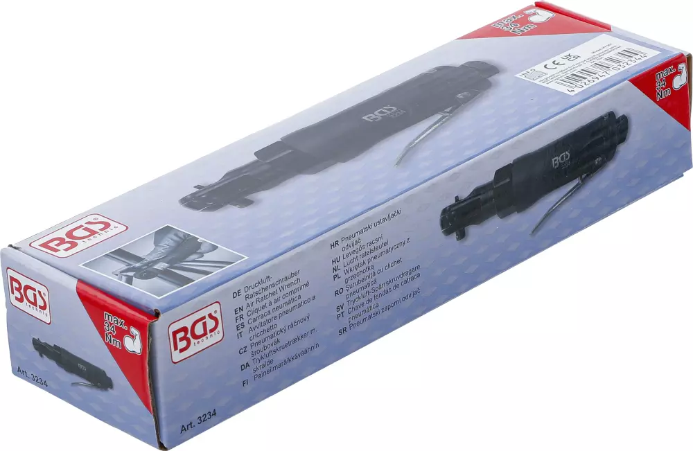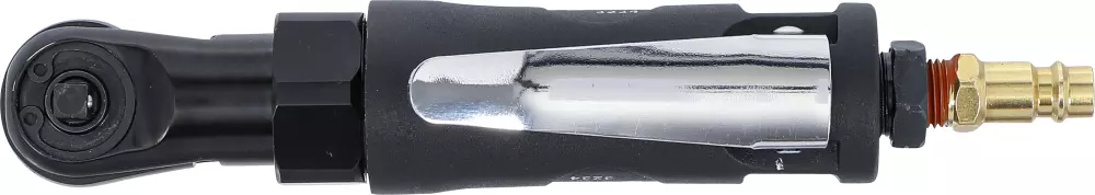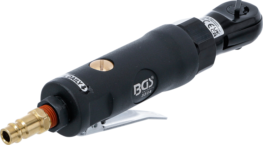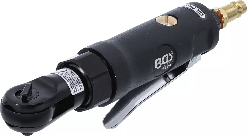 Il cricchetto pneumatico BGS, con una dimensione di azionamento di 6,3 mm (o 1/4") e una coppia di 34 Nm, è un utensile pneumatico utilizzato per serrare e allentare bulloni e dadi in spazi ristretti.