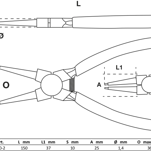 Pinza per anelli elastici interni 150 mm