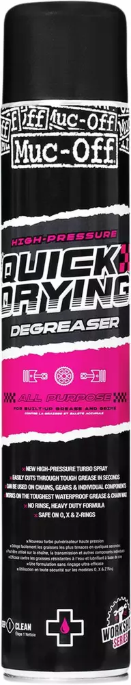 Niente più interminabili sessioni di pulizia in cui il grasso resiste. Con Muc-Off Fast Dry Degreaser 750ml, dite addio alla sporcizia in un attimo. Grazie al turbo spray ad alta pressione, questo sgrassatore affronta il grasso ostinato, anche quello che sembrava essersi depositato da sempre. Rimuove facilmente il grasso resistente all'acqua e la cera della catena in pochi secondi, senza bisogno di risciacquare.