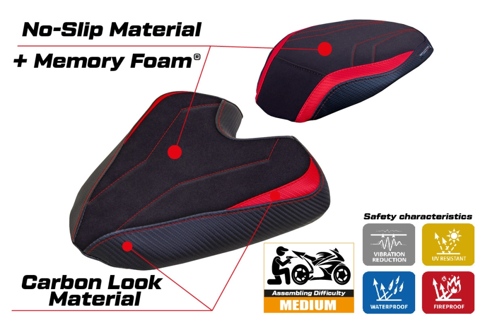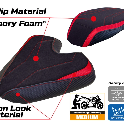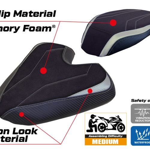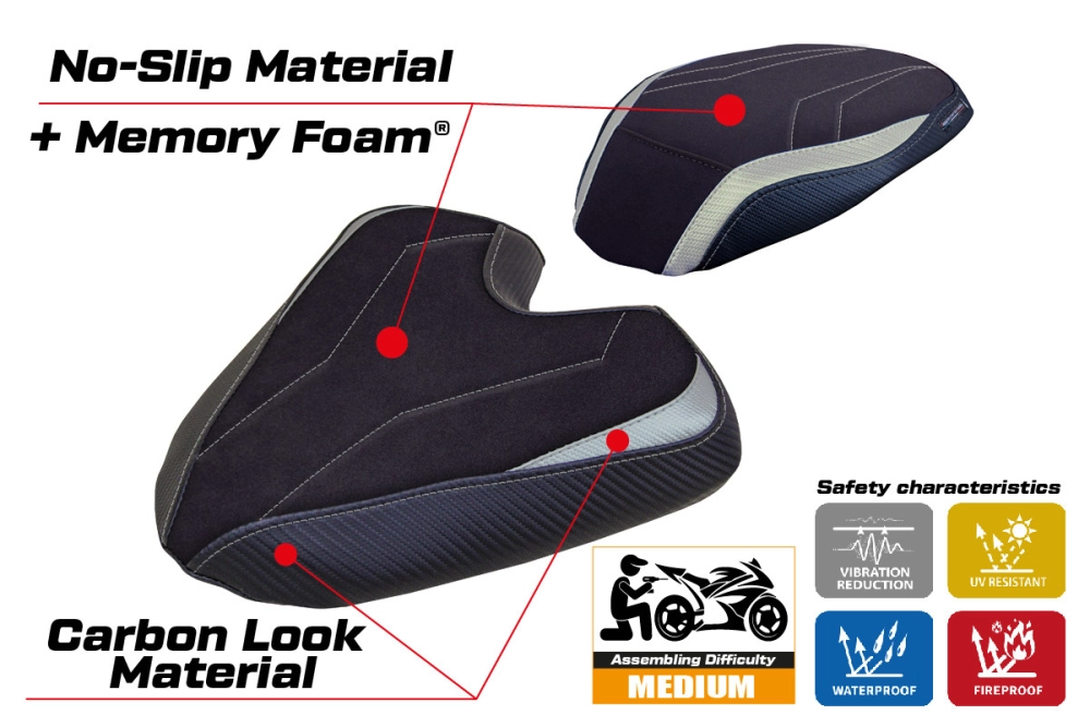 - Sistema comfort: Questa fodera è esternamente esattamente uguale a tutte le altre, ma è accoppiata all'interno con uno speciale strato di 2,5 cm di memory foam. Tappezzeria Italia è l'unico produttore ad utilizzare la tecnologia Memory Foam, che migliora il comfort di guida riducendo la fatica e le vibrazioni della moto.