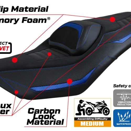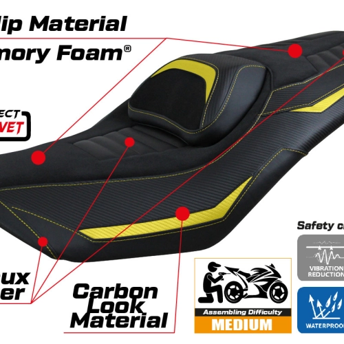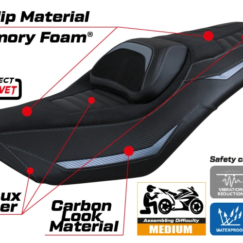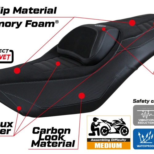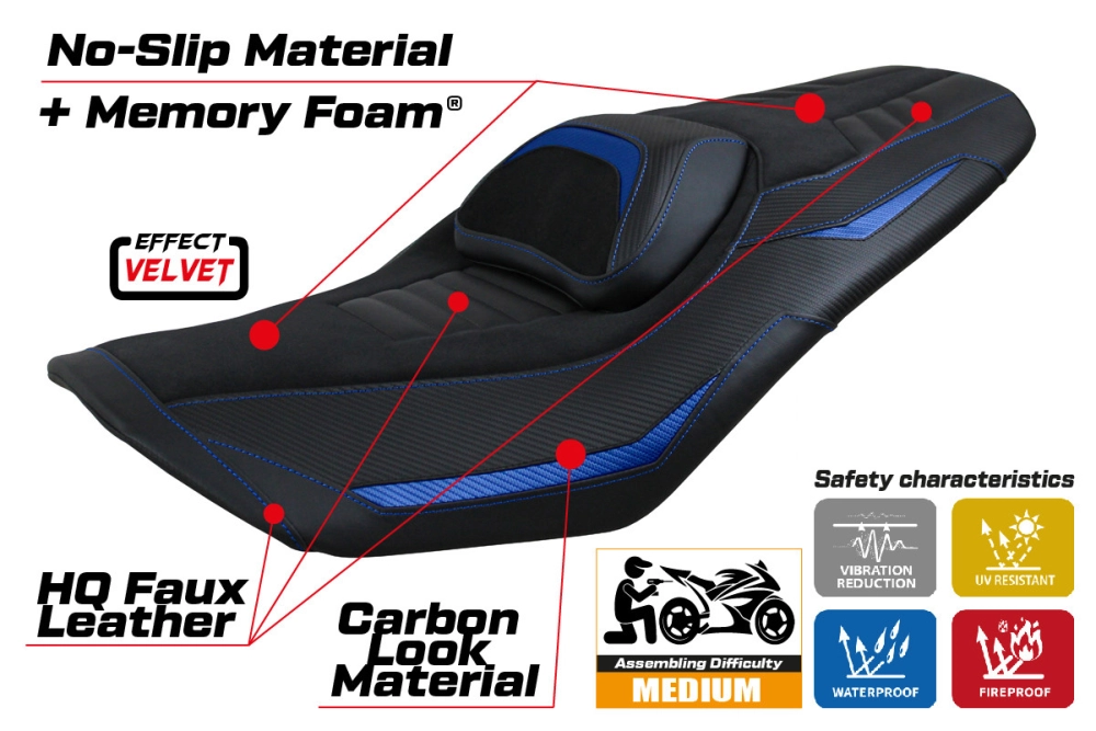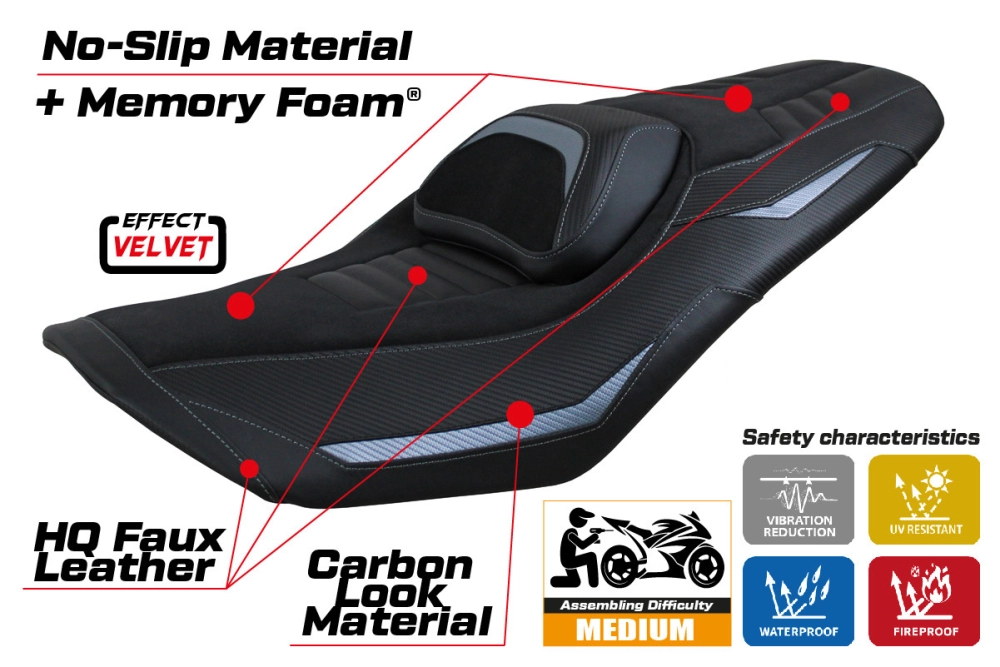 - Sistema comfort: Questa fodera è esternamente esattamente uguale a tutte le altre, ma è accoppiata all'interno con uno speciale strato di 2,5 cm di memory foam. Tappezzeria Italia è l'unico produttore ad utilizzare la tecnologia Memory Foam, che migliora il comfort di guida riducendo la fatica e le vibrazioni della moto.