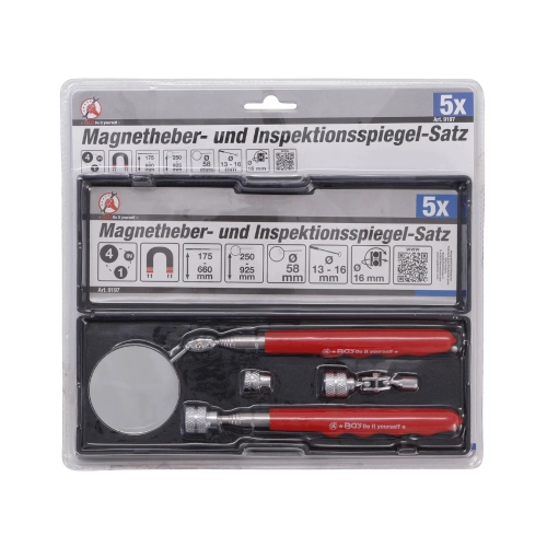 Set di magneti di sollevamento e specchi di ispezione, ideale per i lavori di manutenzione e meccanica. Comprende un'impugnatura ergonomica, un'asta magnetica telescopica (da 175 a 600 mm), un'asta a specchio rotante (da 250 a 600 mm), due teste magnetiche intercambiabili ed è facile da riporre nella sua cassetta di plastica. Uno strumento versatile per ispezionare o recuperare viti e parti in aree difficili.