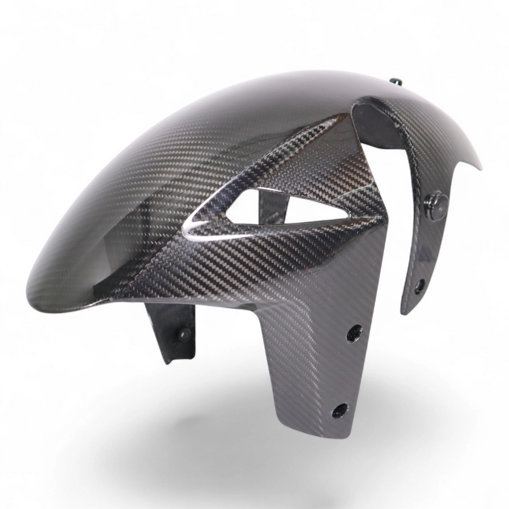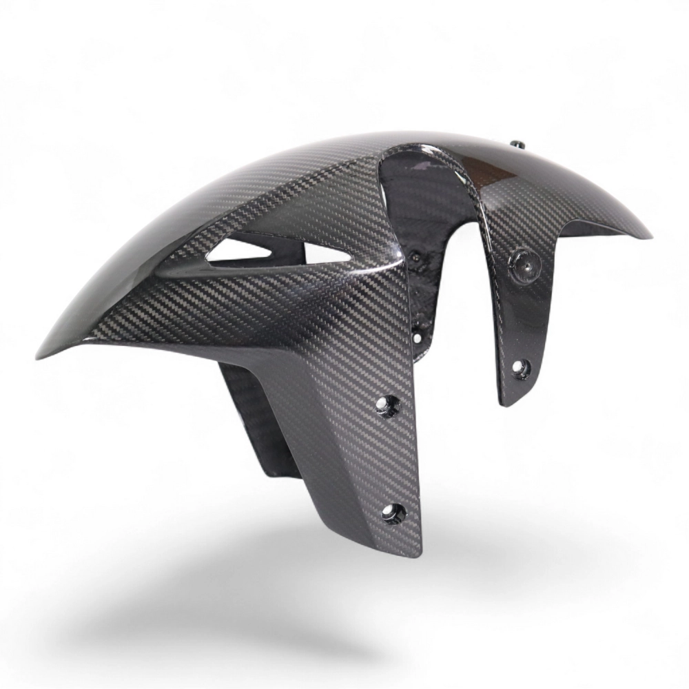 Parafango anteriore Carbon CFMOTO 675SR consegnato senza viti o altri fissaggi. I fori sono già praticati sulle carenature per moto in carbonio. I pezzi sono disponibili con vernice lucida o opaca.