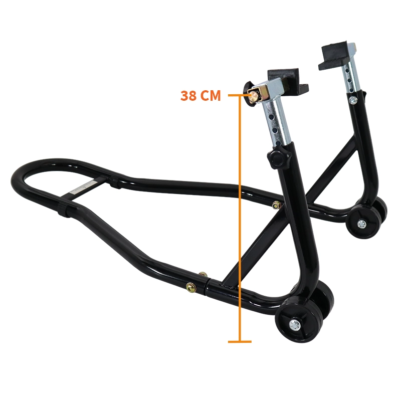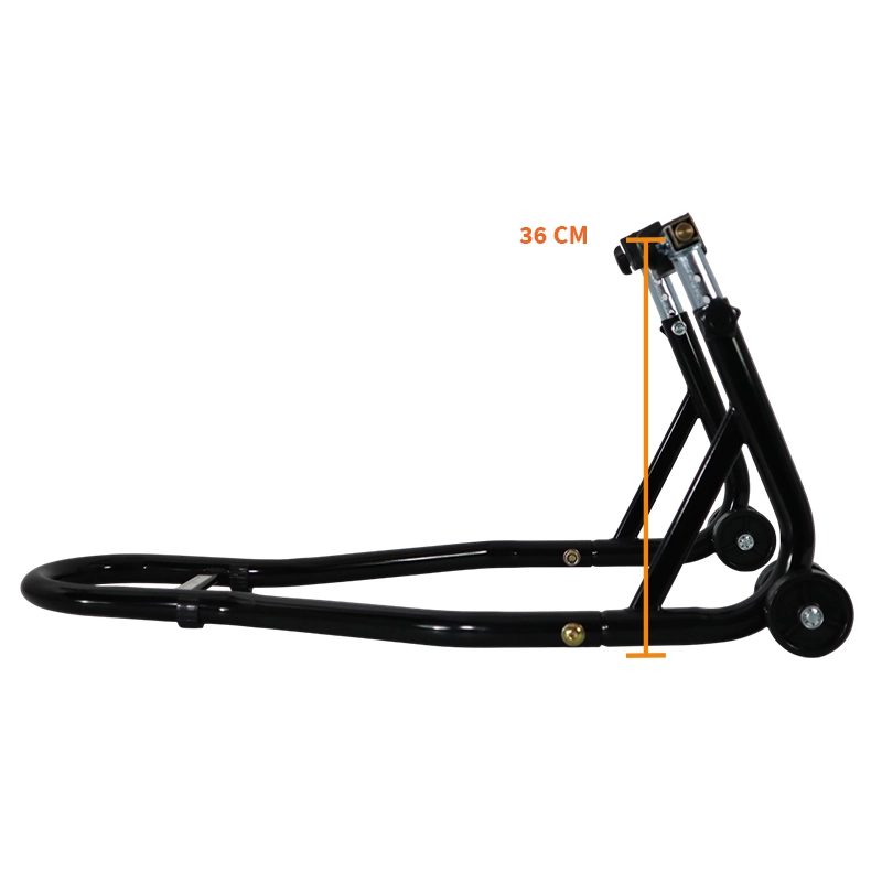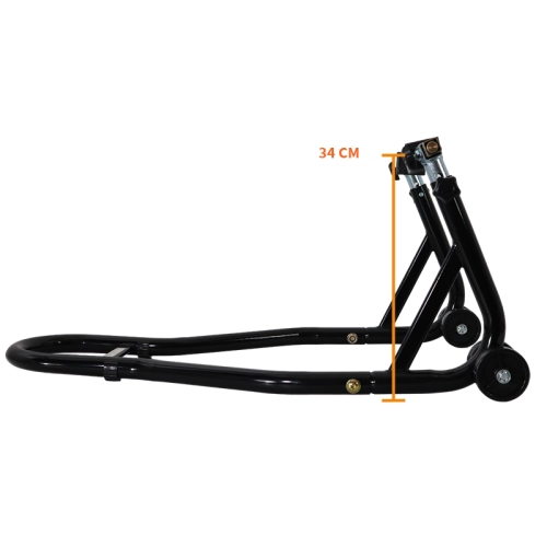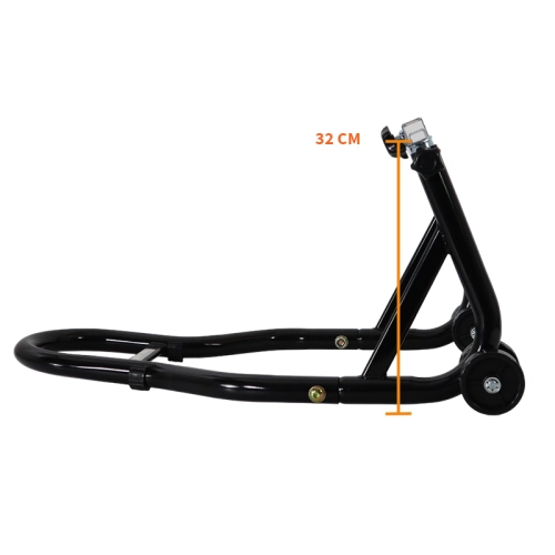 Cavalletto posteriore per moto regolabile in altezza da 32 a 38 cm, venduto con kit di tamponi per cavalletto posteriore.