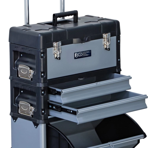 - Composto da tre elementi staccabili: 1 scatola con coperchio ribaltabile e maniglia di trasporto, 2 cassetti, 1 scomparto ribaltabile